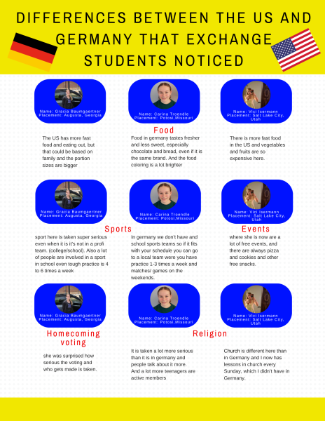 Carina has recently started playing tennis again here at Potosi High School. She first started playing in 1st grade and then stopped in 6th grade but is now playing again. Carina’s favorite American food is Chick-Fil-A. She stated, “American food does not compare to German food.” She has tried to make German recipes here but she said “it just doesn’t taste the same and the foods here are very processed.”